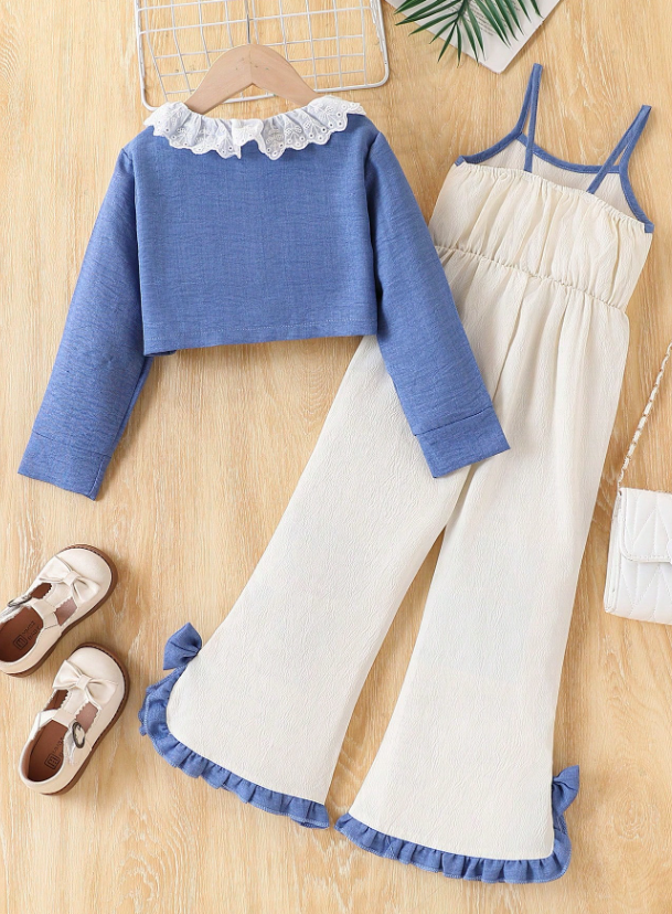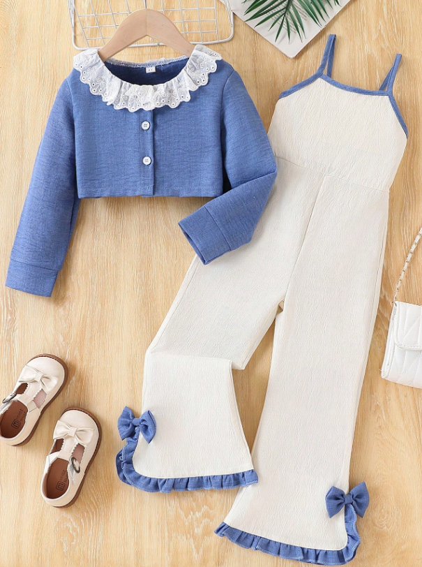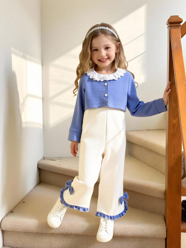 2-Piece Young Girl Casual Outfit – Solid Color Long-Sleeve Cardigan with Lace and Jumpsuit with Bow, Suitable for Casual Autumn Wear