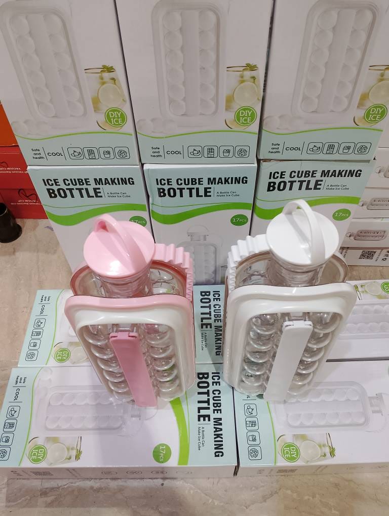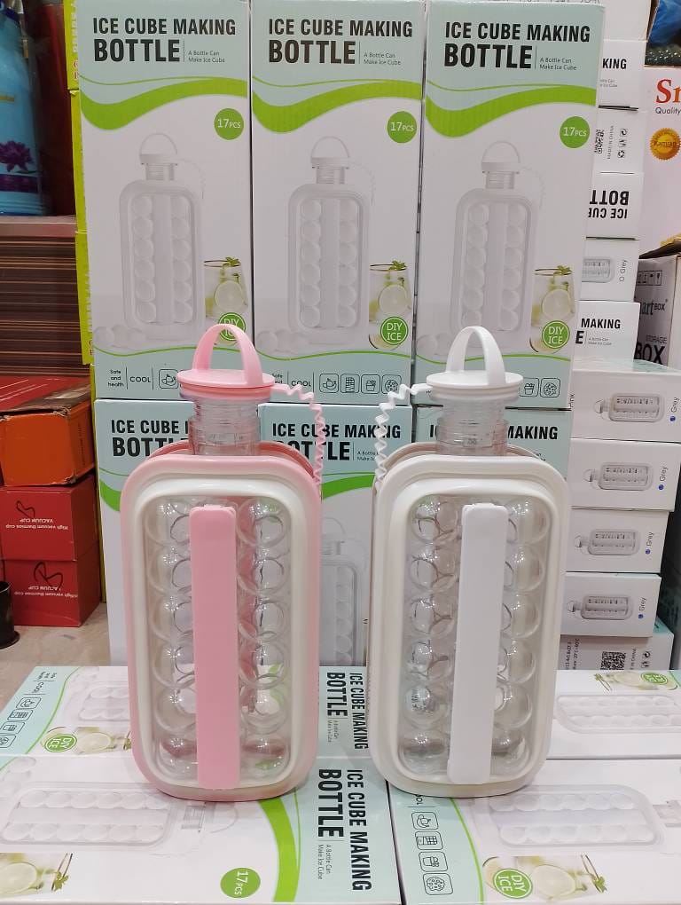 Ice Cube Making Water Bottles designed for making and storing ice cubes or ice balls conveniently. It serves as both a water bottle and an ice cube mold, allowing you to create ice cubes or ice balls directly within the bottle. portable and often foldable design for space-saving and easy transport, with a handle for convenient carrying.
