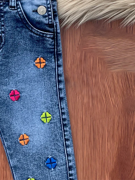 Bright, bold, and built for movement — the Multicolor Magic Girls’ Blue Dungaree Overall is a playful twist on a classic favorite. Designed with vibrant multicolor accents and crafted from soft stretch denim, this overall offers both eye-catching style and everyday comfort.