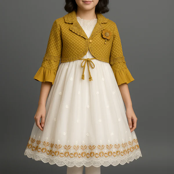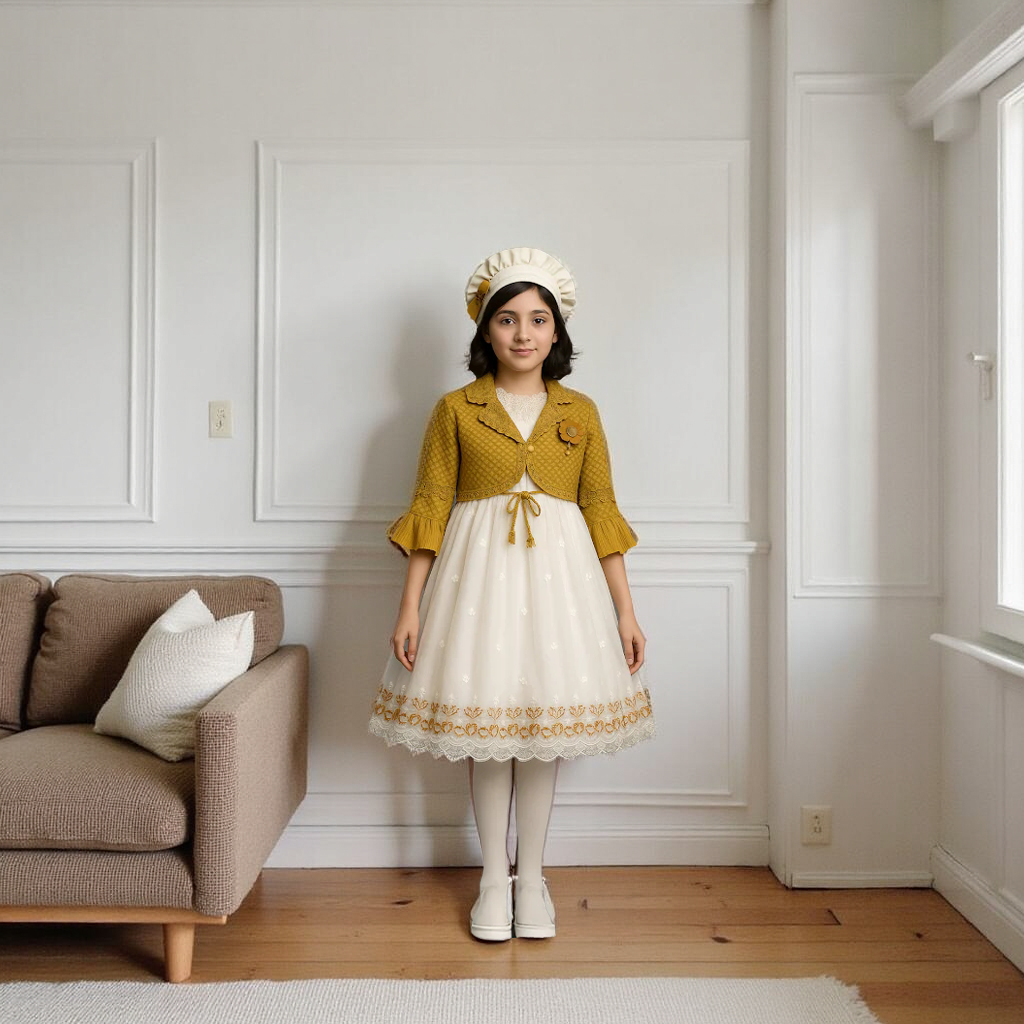 This timeless ensemble features an off-white frock with delicate embroidery along the hem, perfectly complemented by a mustard knit shrug with pleated sleeves and a matching flower brooch. The coordinating bonnet-style cap completes the vintage look, ideal for formal gatherings, Eid celebrations, or afternoon outings.