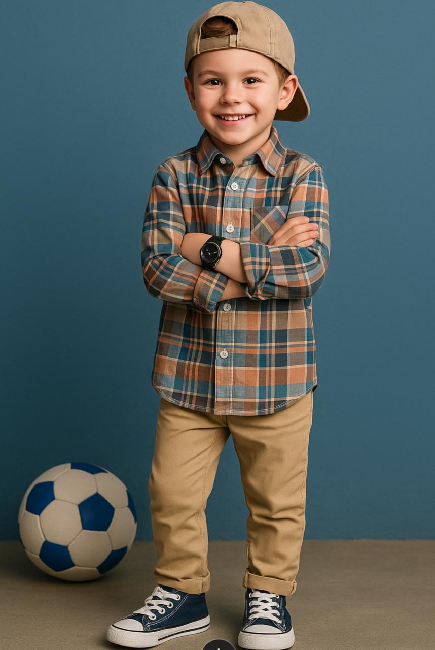 Soft & breathable cotton blend.Stylish plaid button-up with chest pocket.Classic beige chinos with rolled hem option.Perfect for school, playdates, and family outings