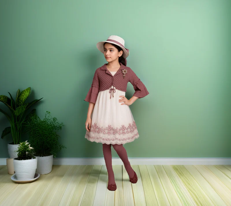 This elegant frock combines a soft ivory base with intricate pink floral embroidery along the hemline, paired beautifully with a rosewood knit shrug featuring pleated sleeves and a floral brooch. Finished with matching tights and a wide-brimmed hat, it’s a graceful choice for tea parties, formal outings, or festive occasions.