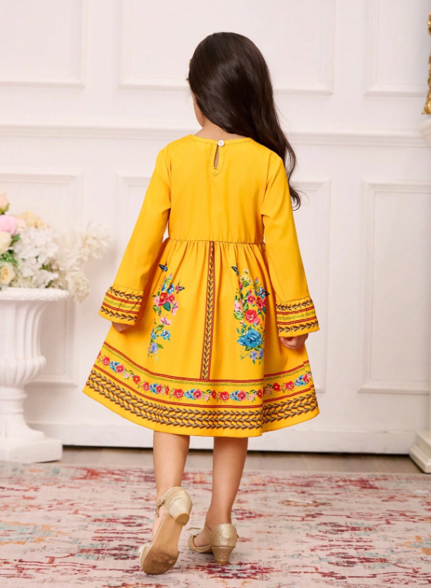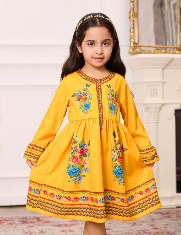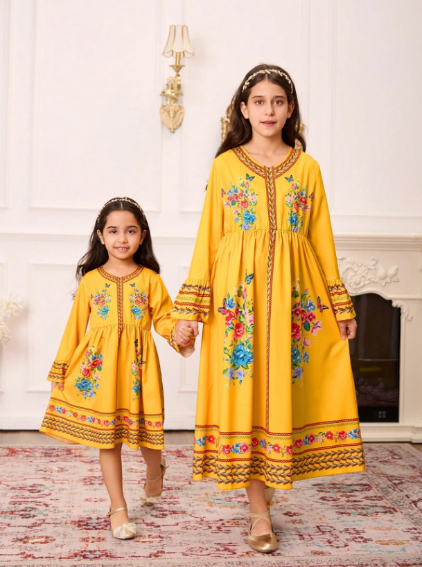 SHEIN Young Girl Sibling Matching Outfits: Short Sleeve Woven Patchwork Dress With Geometric Floral Print & Gold Ornament Trim, Loose Casual Mid-Length Dress Suitable For Outdoor Photo Shoot (3 Pieces Sold Separately)
