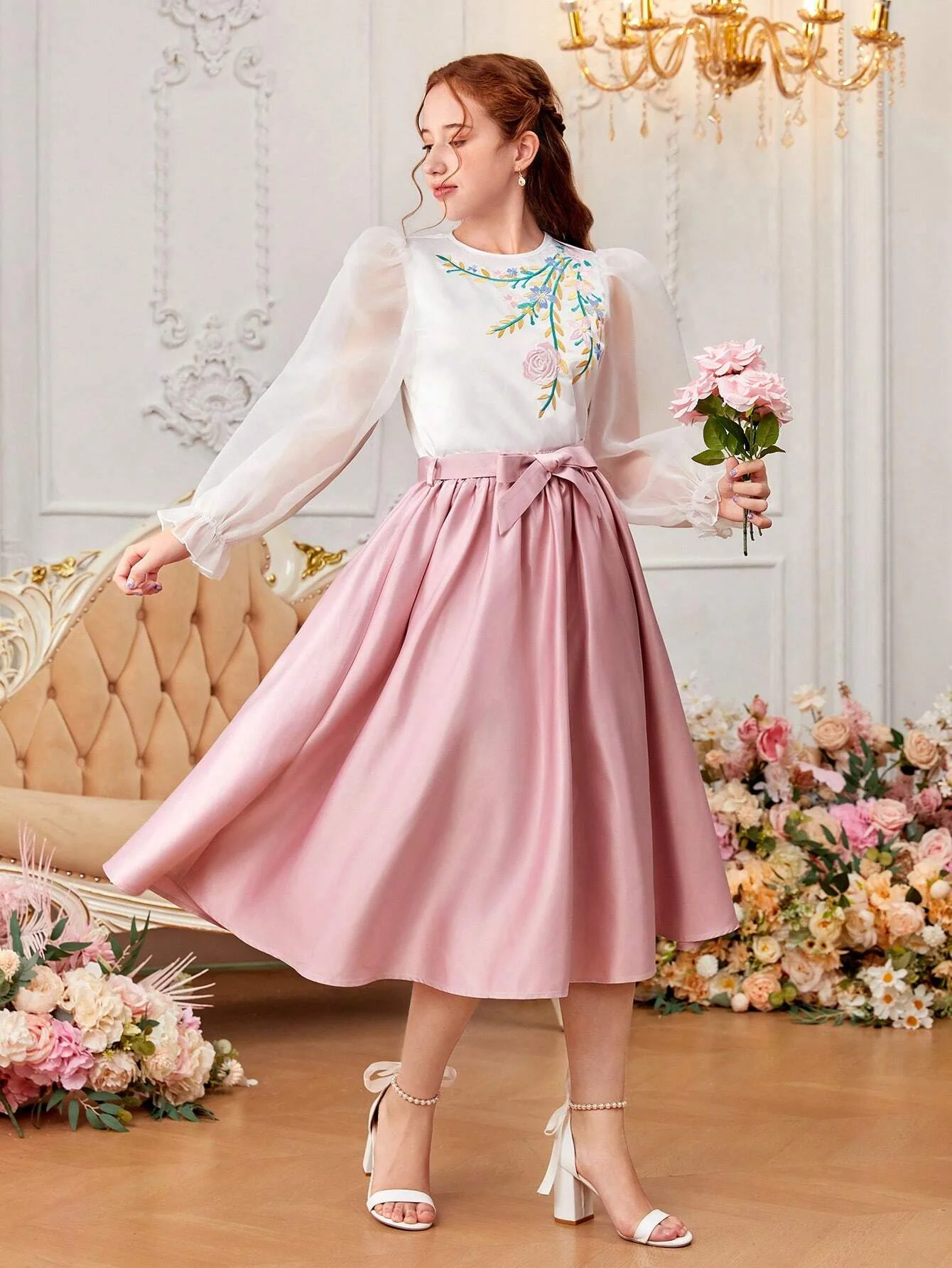 2pcs/Set Teenage Girl’s Embroidered Puff Sleeve Shirt And Skirt