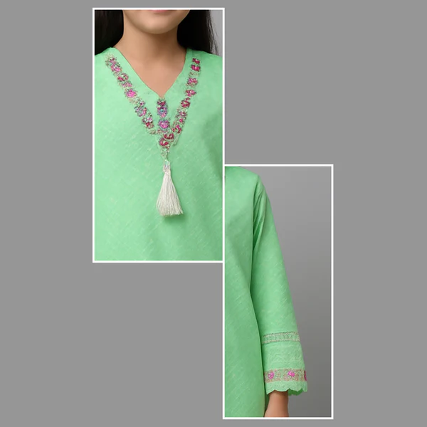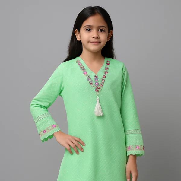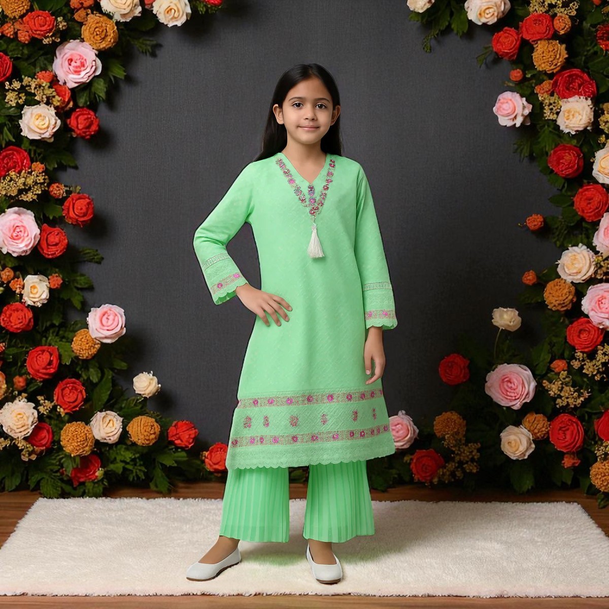Elevate your little one’s look with this elegant 3-piece fine lawn suit. It features a beautifully embroidered shirt, a fancy matching trouser, and a soft tissue fabric dupatta that adds a touch of festive charm. Perfect for semi-formal and special occasions.